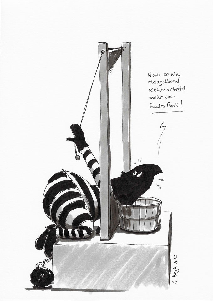 unten: "Mangelberuf" (zum Deutschen Karikaturenpreis 2025, Thema "Jetzt seid ihr dran!)